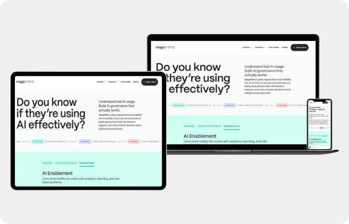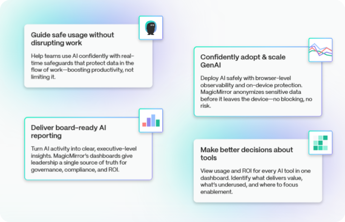 MagicMirror focuses on facts first. Instead of restricting teams, they provide clear insights so leaders can make informed decisions, shape policies, and scale AI usage responsibly. The platform adapts to organizational maturity, protects data locally, and evolves as teams grow.
